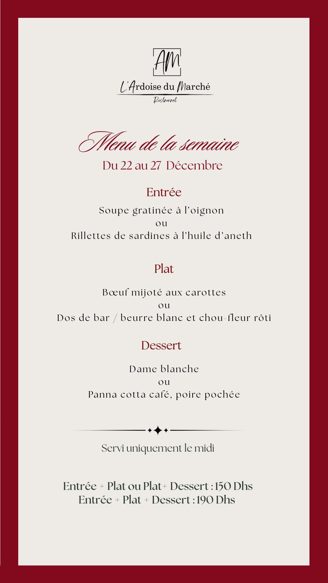 Retrouvez l’effervescence et la convivialité des grandes brasseries parisiennes en plein centre de Marrakech. L’Ardoise du Marché vous accueille dans une atmosphère chaleureuse où le service attentionné rencontre une cuisine généreuse et réconfortante. Que ce soit pour un déjeuner rapide entre deux rendez-vous à Guéliz ou un dîner entre amis, notre brasserie est le lieu de rendez-vous idéal pour ceux qui recherchent une cuisine de qualité dans un cadre élégant et vivant.